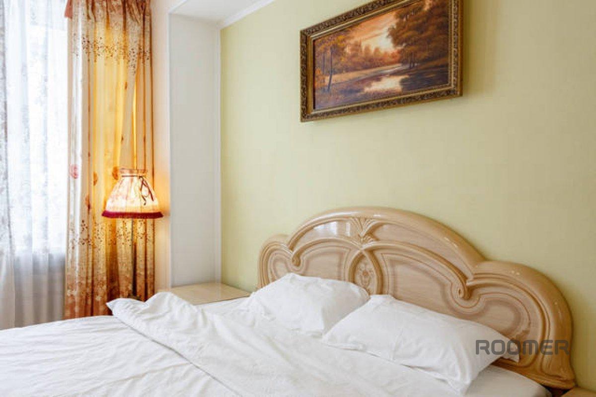 ), bedding , white towels, personal hygiene products, slippers, etc. With a height of 22 floors wonderful views of the Kremlin and the Moscow center. The apartment sleeps 4 (2 +2): a double bed and a sofa bed. On Novy Arbat many cafes, shops, banks, etc. Red Square a 15-minute walk, 3 minutes to the pedestrian historic Arbat Street. Direct line to the exhibition center. This apartment - the perfect place to rent by the day or for a business and leisure trip. The company provides all the accounting documents. Payment by cash or by bank transfer. Price from 3500r. until 6000r. Call us!