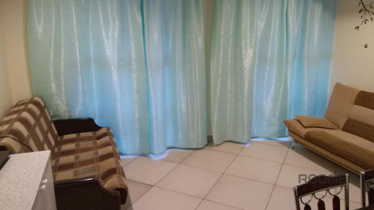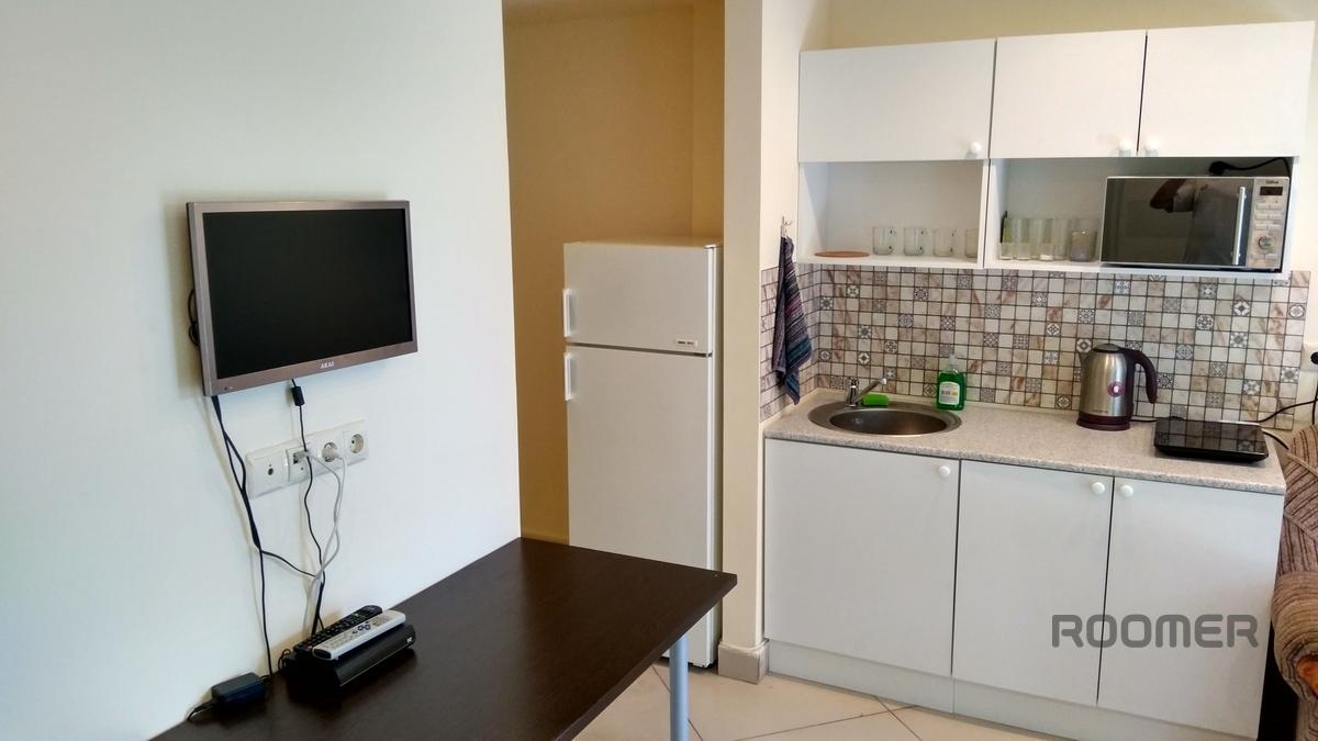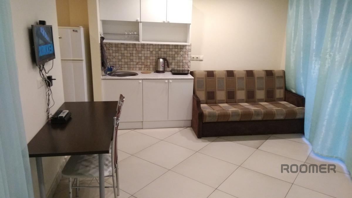 2-room studio apartment near Crocus Expo and Strogino metro in a new building with secure parking: 1/4-storey building, new renovation, large balcony, tiled floor, large double bed with orthopedic mattress, 2 double folding sofas, wardrobe -wardrobe, table, chairs, kitchenette with fridge, electric kettle, induction hob and microwave, washing machine, bathroom with shower, hallway with a hanger and a mirror.