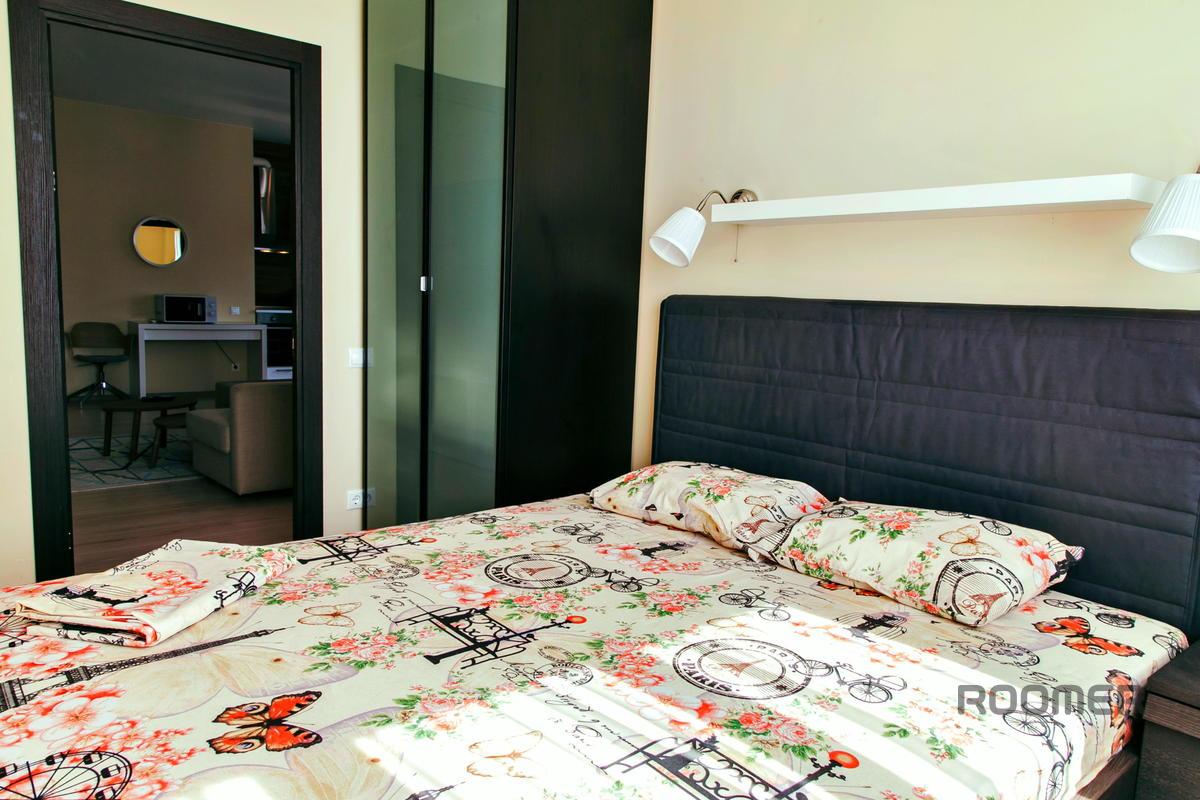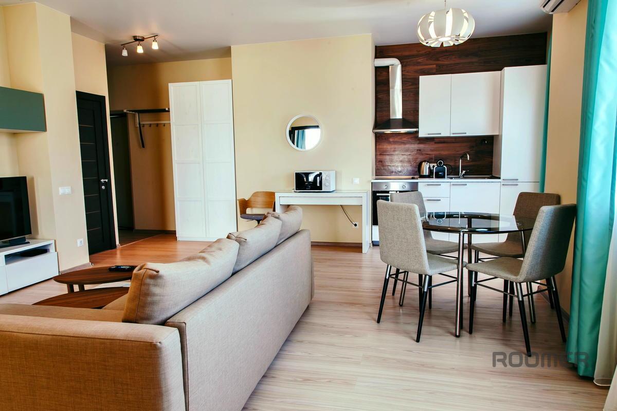Ванная комната с бесплатными душевыми и туалетными принадлежностями.   Удобства и оборудование: БЕЛЫЕ ХАЛАТЫ, ТАПОЧКИ, ПОЛОТЕНЦА, ШАМПУНЬ, ЧАЙ! - телевизор с плоским экраном и кабельными каналами -  бесплатный Wi-Fi -  стиральная машина - духовка, микроволновка, полный набор посуды и моющих средств - ФЕН, утюг, гладильная доска, сушилка для белья   Инфраструктура: - частная охраняемая парковка - остановка общественного транспорта (прямой транспорт в любую точку Сочи от вокзала) - центр города, муниципальные и частные оборудованные пляжи - детская и спортивная площадка во дворе дома - супермаркет, аптеки, продуктовые, кафе и фитнес центр - рестораны, бары и кафе на любой вкус в шаговой доступности   Идеальное место для отдыха и жизни с потрясающим видом в одном из элитных комплексов Сочи.